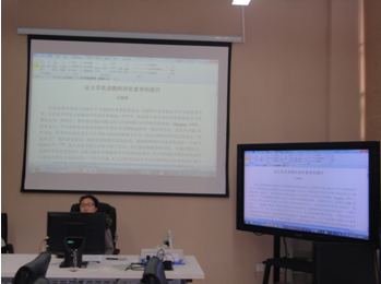 研讨会由“教师发展研究小组”组长施惠平副教授主持。研讨会首先是论文交流环节,王伟炜老师介绍了她的论文《论大学英语教师评价素养的提升》并恳切希望在座的老师给她提出修改意见,严敏芬教授、张洁帆老师和秦朝霞老师等都对论文的修改方向提出了宝贵的意见和建议。接着,英语专业研二学生王姣介绍了她华体会体育教师“反思性教学”的研究,随后施惠平老师就此研究内容和方法进行了解释和评论;随后,英语专业研一学生张艳秋汇报了她和张小华同学去上海参加的Gary Barkhuizen教授的讲座“Narrative Inquiry of Professional Development”,严敏芬教授也就此研究课题进行了相关介绍。随后,在座的师生还就这些研究课题进行了讨论。