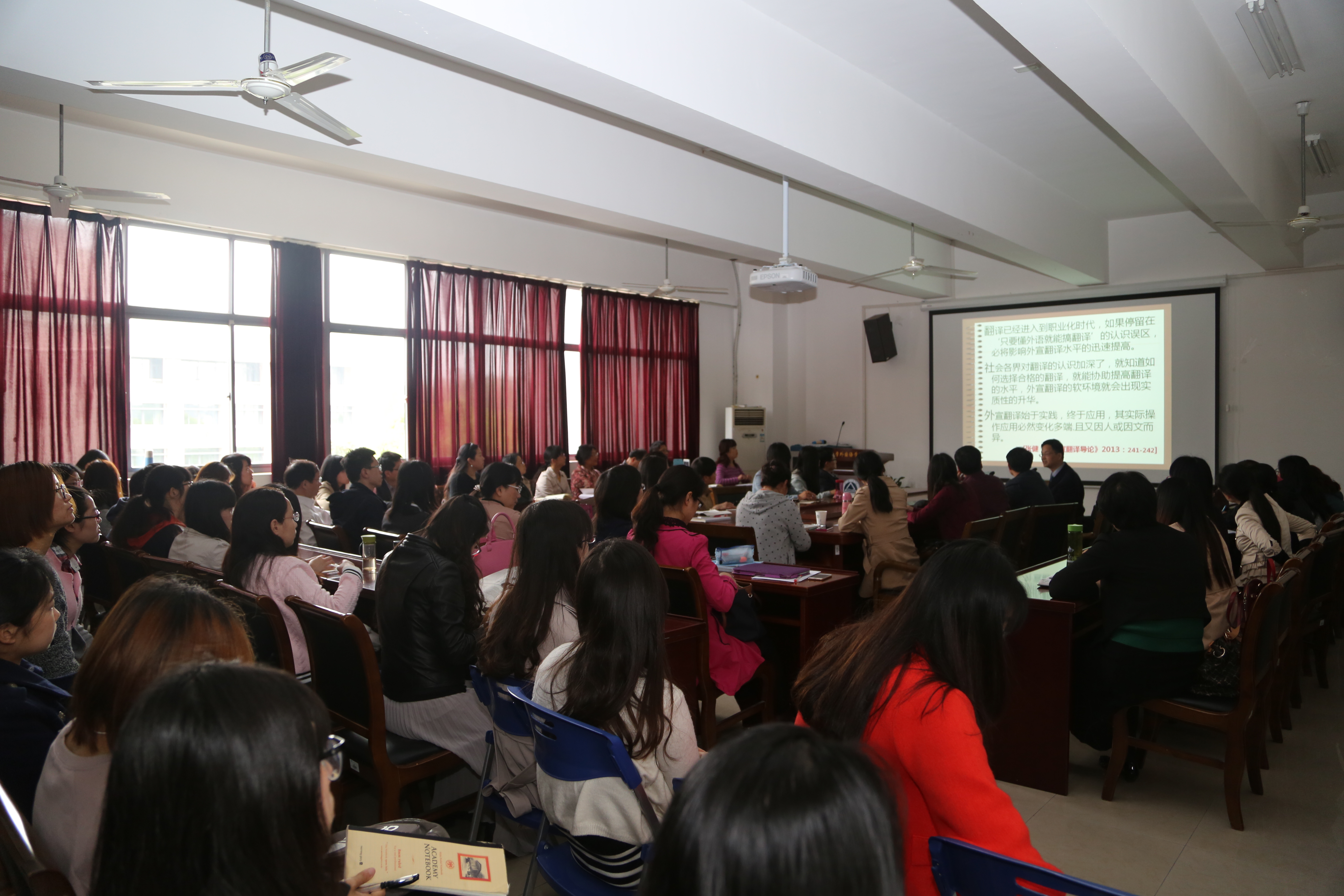 张健教授首先从误译的定义与表象入手,指出了翻译中误译的四大根源:语用、文化、语言与文本类型。接着,介绍了全球化背景下外宣翻译的定义与外宣材料的类型,进而指出外宣翻译工作中尚存的两大认识误区,即把外宣翻译简单等同与汉译外、重文学翻译而轻应用翻译的不均衡倾向,并对常见的外宣翻译误译类型进行了整理与分析。张教授认为外宣翻译工作要做到讲好中国故事、传播好中国声音,既需要遵循一定的翻译规范与通则,也需要认真阅读,身体力行去体验、去学习、去感悟、去实践,在对外译介传播过程中要注重提高我国的话语权,构建积极正面的国家形象。张教授谈吐幽默、例证鲜活、妙语如珠,博得了在座听众的阵阵掌声。最后,张教授还回答了师生们的提问,讲座在欢快的交流中圆满结束。