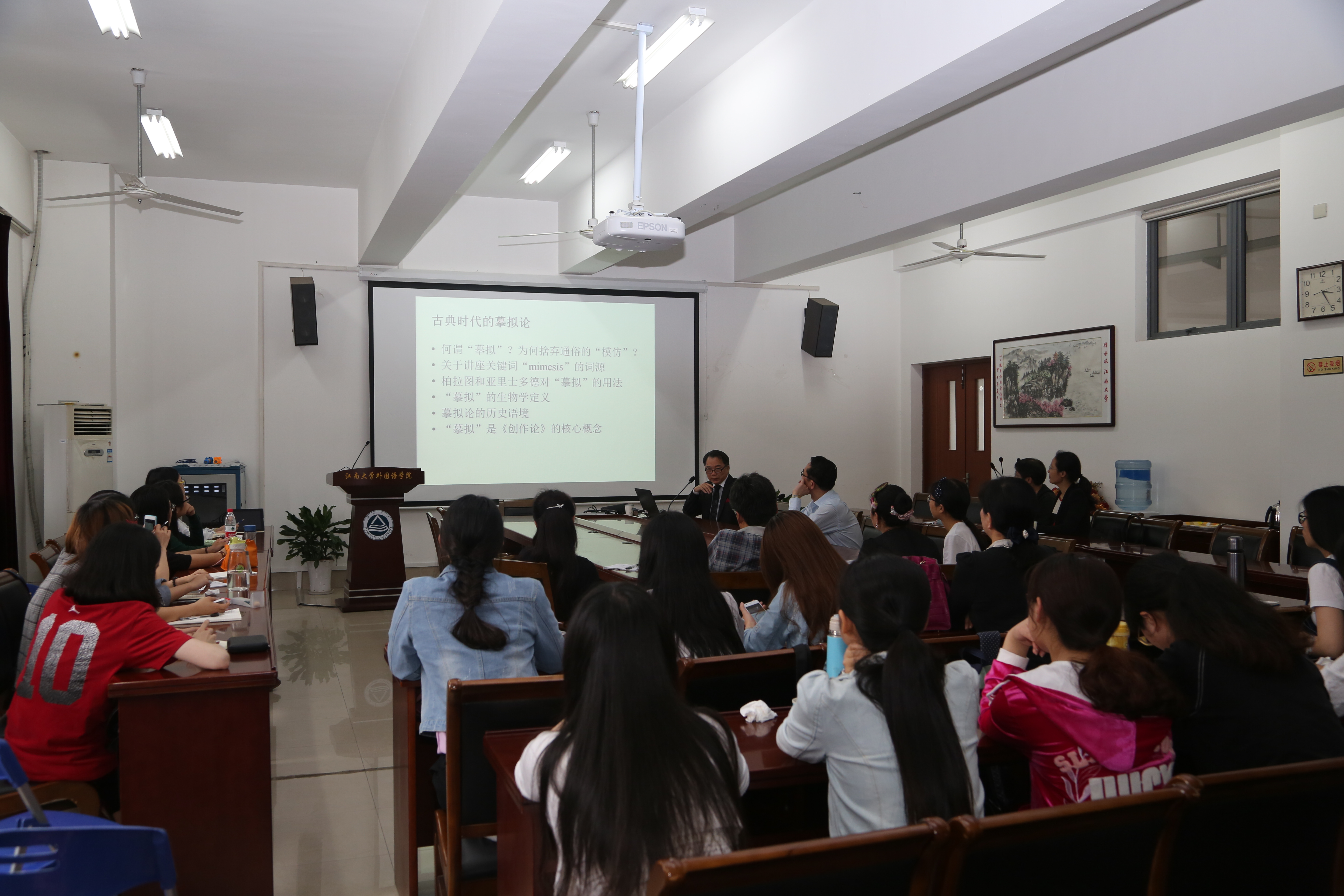 在领略了十六世纪英国文学经典的风采后,张汉良教授又带领师生们走进了符号学、哲学与美学相结合的殿堂。张教授以柏拉图的《诡辩家》、亚里士多德的《论记忆》和贺拉斯的《诗辩》为例,讲解了古典时代(公元前5-4世纪)的摹拟论,亚里士多德《创作论》的“诗艺”与“诗辩”,以及艺术别类之间的摹拟与“跨媒介符号学的兴起。张教授指出,摹拟区别于模仿,摹拟是创作的动机和鉴赏的条件,摹拟的本能正是艺术的起源。摹拟作为一个艺术总类,是亚里士多德《创作论》的核心概念。