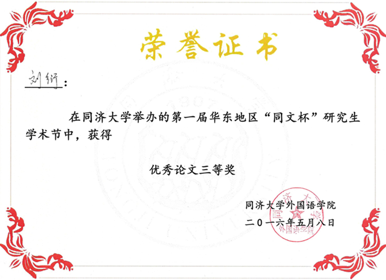 2016年5月8日,第一届华东地区“同文杯”研究生学术节在同济大学足球篮球官方直播平台同文楼隆重举行。来自全国26所高校的上百名研究生济济一堂、共飨学术盛宴,围绕“国际视野与中国语境观照下的外国语言文学研究”这一主题,在语言学、文学和翻译等研究领域进行了充分交流。本次学术节共收到来自北京大学、中国人民大学、复旦大学、同济大学、中南大学、华东师范大学、上海外国语大学以及江南大学等26所高校的博士和硕士研究生投稿论文105 篇。我院方文开教授指导的2014级硕士研究生刘衍携论文参加了此次学术节。