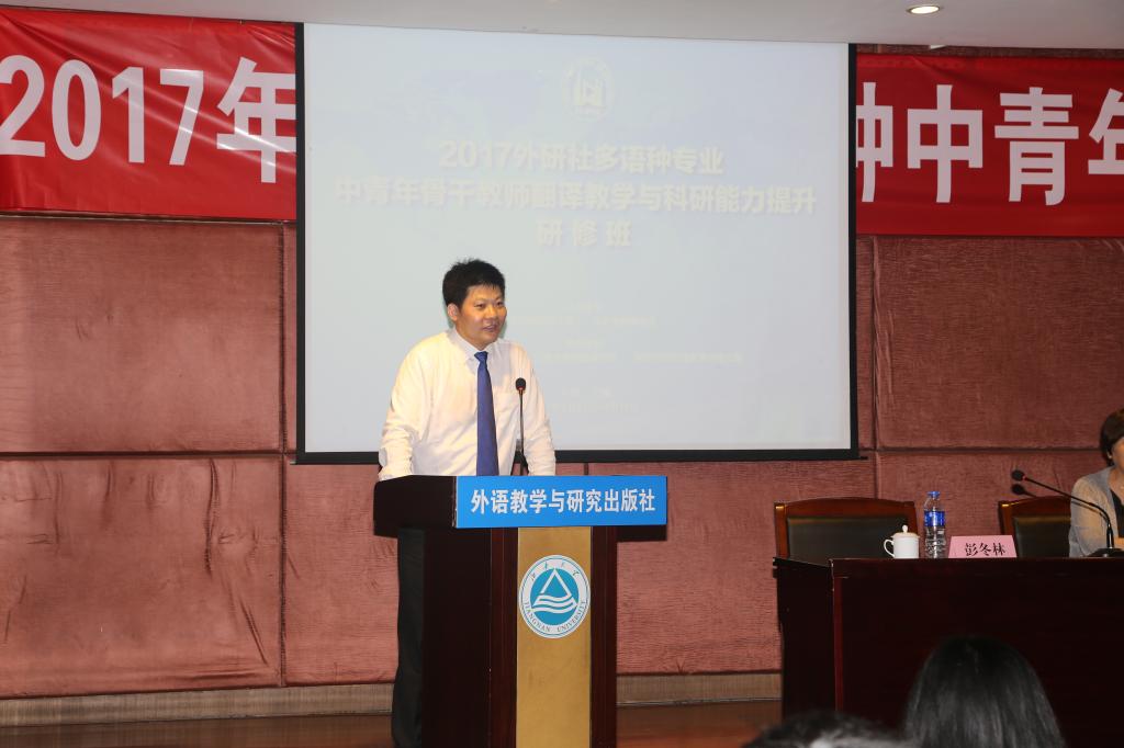 开幕式上,外语教学与研究出版社综合语种分社社长彭冬林、培训专家代表刘和平、我校足球篮球官方直播平台院长龚晓斌与外语教学与研究出版社华东信息中心主任王建平分别致辞,寄语参与培训的教师学员,希望他们通过口笔译教学演示、口笔译工作坊、口笔译理论与研究三方面的学习来掌握先进的翻译教学理念与方法、提升翻译教学设计能力、开拓翻译学科科研思路,为今后的口笔译人才培养与科研创新开创有利条件。