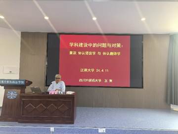 随后,王寅教授从语言哲学的演进为切入口,向在场师生介绍了了认知语言学的体认转向。他指出,哲学与语言学一脉相承,密不可分,语言学来源于后现代哲学,脱离哲学观念和哲学思维去研究语言学是不全面的。因此,鼓励语言学者们应借助哲学思维促进认知语言学向体认语言学的发展。除体认语言学的外,王寅教授还提出应该将体认思维扩大到语言学相关的学科中去,以此促进体认翻译学等相关学科研究体系的发展。