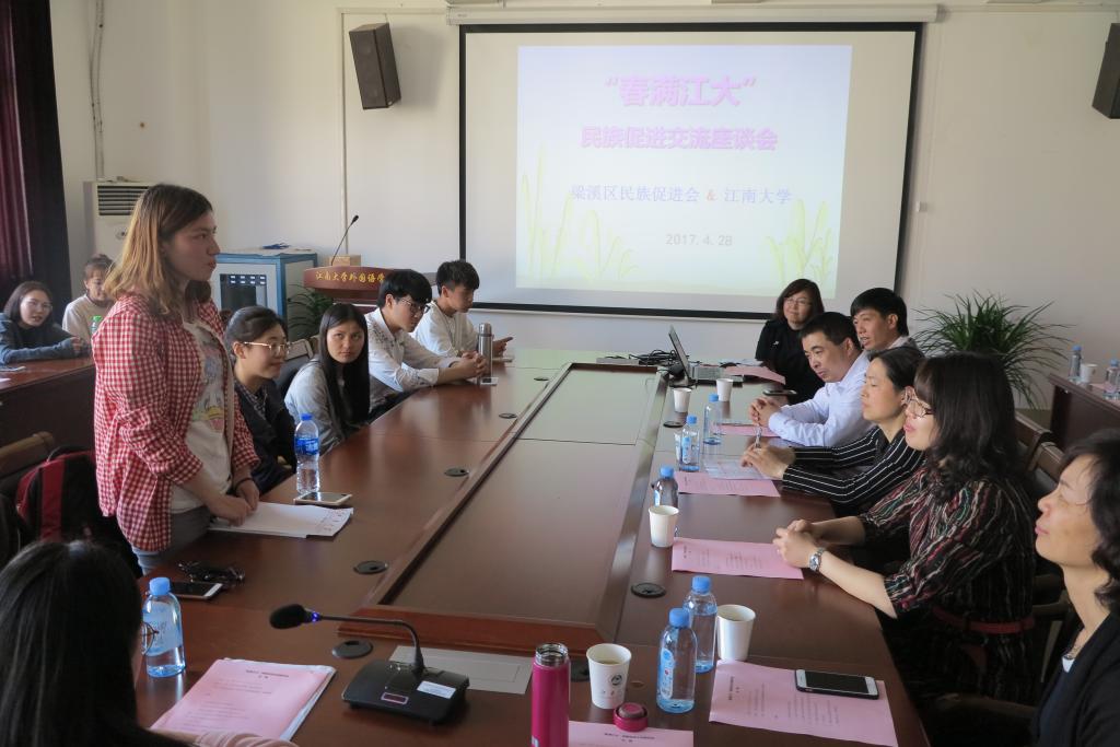 紧接着,梁溪区民族促进会黄国斌会长讲话。 黄会长与同学们亲切交谈,询问大家在大学期间生活、学习等各个方面的情况,并希望能为大家提供各方面的帮助和指导。黄会长希望大家珍惜并充分利用好大学时光,学习专业知识、提高能力和素质,从而可以用自己的能力回报家乡、回报社会、回报学校。接着,英语1601班班长李禹霆作为少数民族学生代表发言。梁溪区民族促进会会员分别发言,大家都对同学们寄予厚望。同学们也分别介绍自己的家乡和民族,促进了文化的交流和传播,巩固了民族团结。梁溪区民宗局邹鸣萍书记总结讲话。