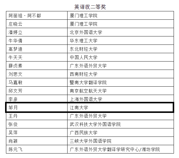 据悉,本次大赛面向45岁以下的海内外广大翻译工作者和翻译爱好者广泛征稿,本届竞赛分别设立汉语与英语、法语、俄语、西班牙语、阿拉伯语五个语种双向互译,共计十个比赛项目,参赛者可任选一项或同时参加多项竞赛。自今年1月中旬赛事发布公告开始,到5月下旬参赛稿提交截止日期前,邹月同学在足球篮球官方直播平台英语系孙志祥教授的指导下,数易其稿,对译文精益求精,经过激烈的角逐,邹月的参赛作品获得英译汉二等奖。