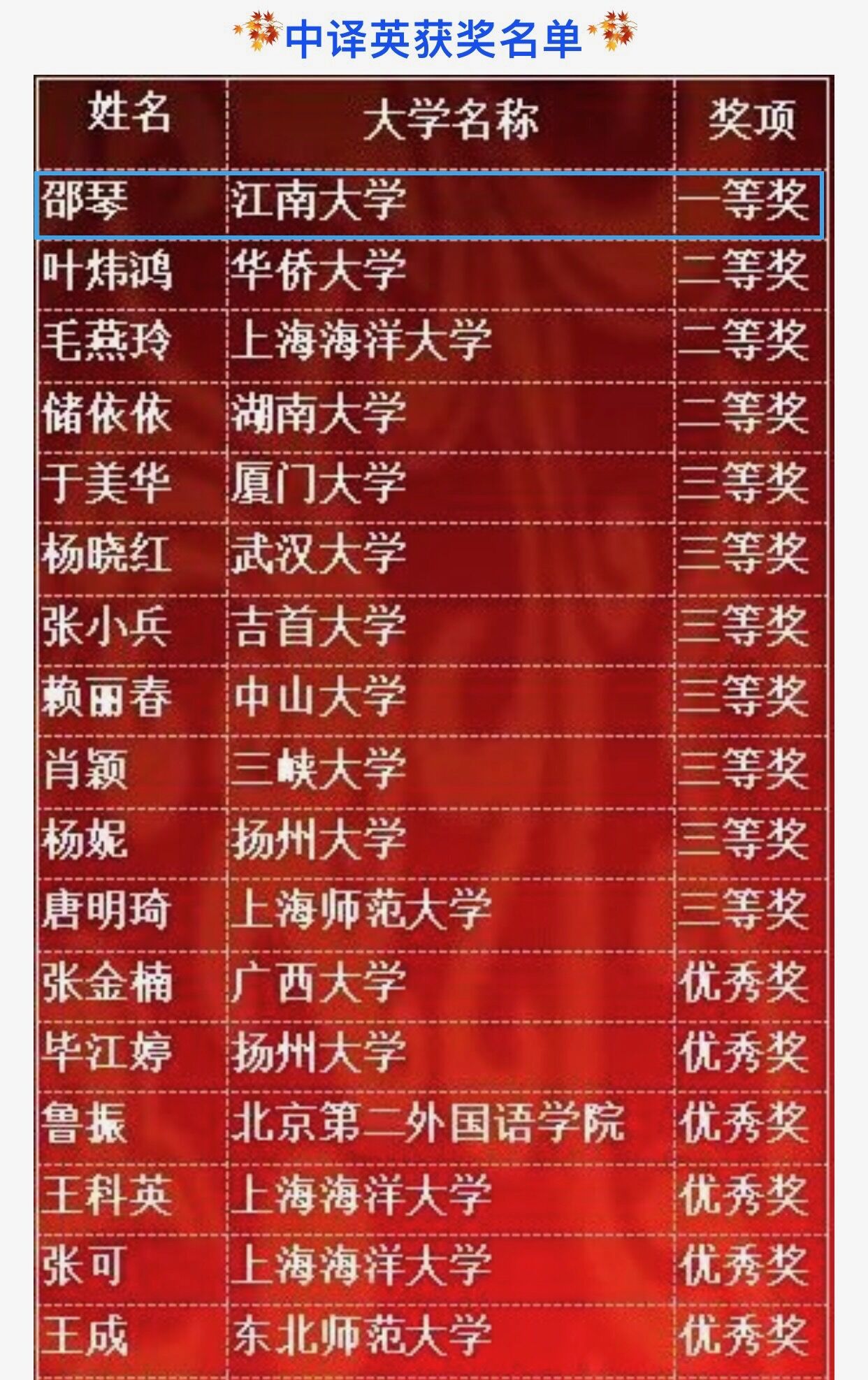 获奖名单公示
