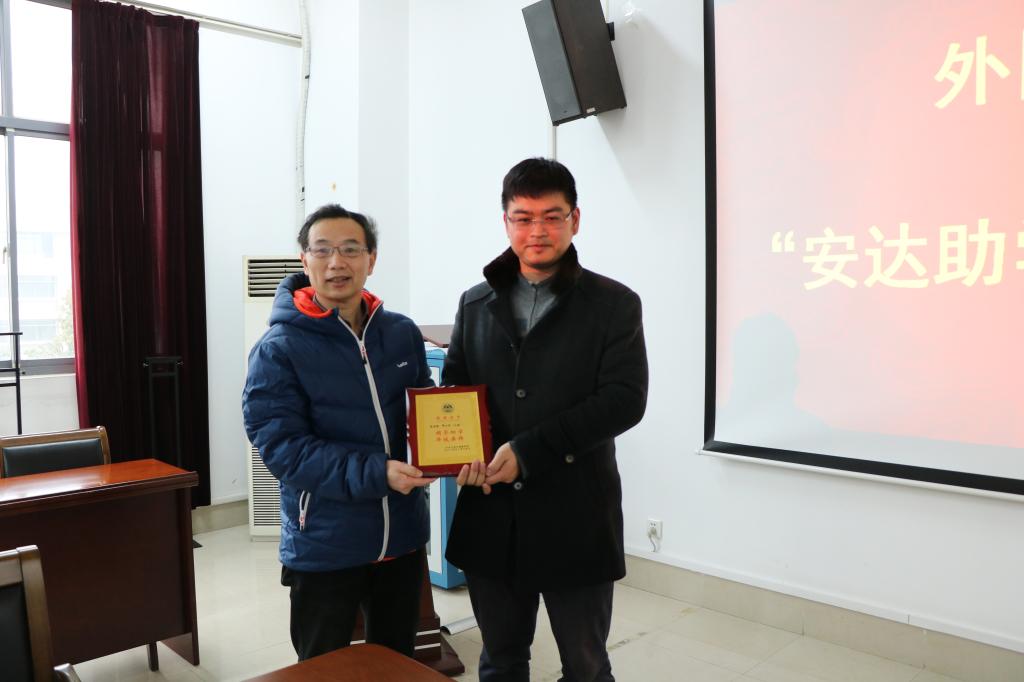 随后,由捐赠人安达公司代表陈志刚先生发言。他用亲身经历鼓励同学们要静下心来学习,向身边的人学习,多多积累经验,为日后生活做长远打算。之后由学院党委书记黄城芳为安达公司颁发捐赠证书,并再一次对安达公司在我院设置助学金的善举表示感谢和敬意。