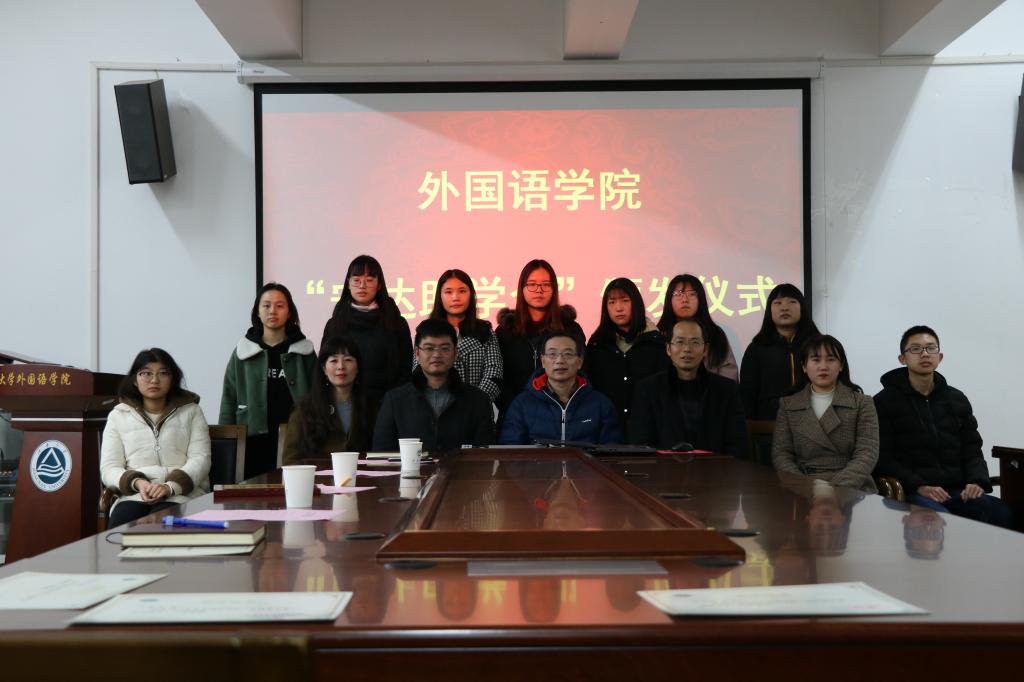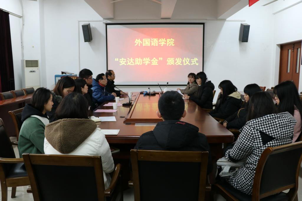 2019年1月15日下午15:30,华体会体育“安达助学金”颁发仪式在足球篮球官方直播平台楼会议室A349举行。学院党委书记黄城芳、党委副书记刘伯贤、负责学生资助工作辅导员张圆、英语1701班班主任胡燕萍、无锡滨湖安达汽车综合性能检测有限公司陈志刚先生,以及获助学金的10位同学出席仪式。仪式由院分团委副书记张圆主持。
