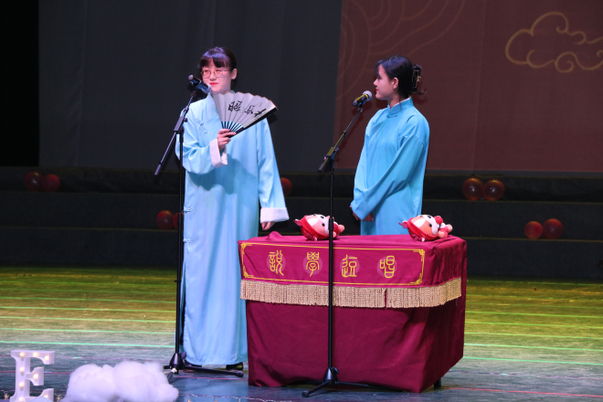 晚会开场由乐队表演带来《Don't cry》,气氛热烈,燃爆全场。随后,晚会正式开始。学院英语系教师带来的朗诵《起航》,表达了老师对学生的美好祝愿与期待;民族舞《烟雨丽人行》舞步优美,极具中国风的优雅与端庄;相声《新学外语》语言风趣幽默,现场观众在相声包袱中欢笑一片;英、日歌曲《Last Christmas+打上花火》,年轻富有朝气的歌词和曲风点燃现场气氛;院艺术团带来的舞蹈《Kill this love》青春活力,展现了外院学子昂扬向上的风貌;20级带来的英文情景剧《Love story》融合当下幽默喜剧元素,展现了20级新生极佳的创意;校艺术团带来的走秀《Feelings》,活力四射,瞬间点燃全场同学的热情;由田村恭平老师和吴丹凌带来的器乐《糸》,为大家呈现了音乐盛宴;话剧《土拨鼠之日》轻松欢快,是专业与节目的有效融合;男舞《Doubtle knot+Bad guy》,热情欢快的舞步洋溢着青春气息;器乐《幻化成风》美妙动听;幕布情景剧《就这Young!》以新颖的方式呈现校园青春故事,现场观众沉浸在幕布剧营造的氛围中;最后外院学生会为大家带来大合唱《喜欢你》,晚会在热烈的气氛中圆满结束。