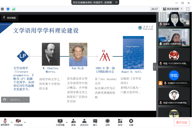 本次圆桌交流会共分三部分。第一部分为原理讲解,首先,张老师从文学、翻译、语言学三方面入手,讲述了三者密不可分的关系及组合研究的可能;随后,张老师从哲学角度出发,以通俗易懂的语言解析文学及语言学与现实世界、人类意识的关系。张老师的分享条理清晰、语速合适,其独特的讲授方式深深吸引了与会同学。第二部分通过张老师门下研究生朱雨珩和马芳芳的分享引入,两人分别介述了文学语用学及乔治·奥威尔小说的语言之力。二者的分享虽侧重不同,但都紧扣会议主题,旨在以案例分享“文学与语言学之交点”所在何处。第三部分为讨论答疑环节,参加交流会的同学就此次探讨问题及平时困惑踊跃提问,张老师及两位研究生热情解答,交流分享各自对于文学、语言学及其交点的看法。