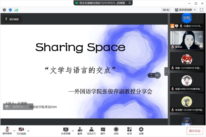“Sharing Space分享空间”是足球篮球官方直播平台学生会在新文科、新外语背景下,旨在为广大外院学子搭建学术、技能等信息分享交流平台。3月26日14时,“Sharing Space分享空间”邀请足球篮球官方直播平台张俊萍副教授线上参与主讲“文学与语言学的交点”主题圆桌会,会议吸引近百名同学参与线上交流。
