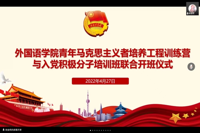 4月27日下午2:00,足球篮球官方直播平台2022年青年马克思主义者培训工程训练营与入党积极分子培训班联合开班仪式通过腾讯线上会议举行,主持人是英语2103班胡金莉。本次开班仪式邀请到足球篮球官方直播平台党委副书记、副院长刘伯贤老师、分团委书记陆芳老师出席,青马训练营和入党积极分子培训班全体学员参加了开班仪式。