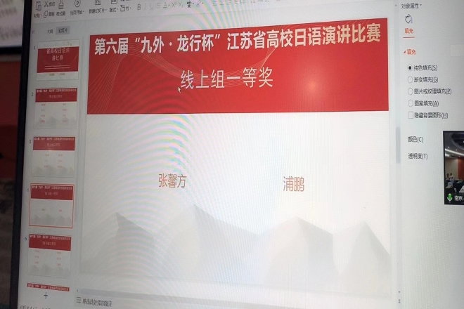 此次因疫情原因,我校选手通过线上参加比赛。比赛分为命题演讲和即兴演讲两部分。我校选手日语系2001班张馨方同学才思敏捷、沉着冷静,最终凭借扎实的日语基础和丰富的知识储备,以第一名的好成绩获得一等奖;中西由美子老师和吴颖老师获得优秀指导奖。