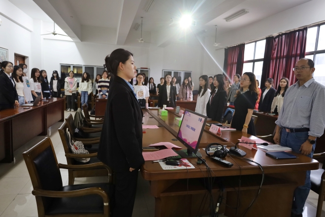 开幕式伊始,全体起立,奏响国歌。随后,学院党委副书记刘伯贤致辞。刘书记的话语中寄托了对同学们的殷切希望。他对青年学生提出了更高的要求,希望大家不负伟大时代,求实创新,勇挑重担。广大青年学子要认真学习文化知识,提高整体素质,身体力行的践行社会主义核心价值观,争当知中国、爱中国、堪当民族复兴大任的新时代“外语人”。