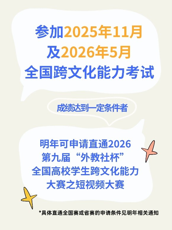 参加2025年11月及2026年5月全国跨文化能力考试,成绩达到一定条件者,明年可申请直通2026年第九届“外教社杯”全国高校学生跨文化能力大赛之短视频大赛。直通全国赛或省赛的申请条件具体见明年相关通知。