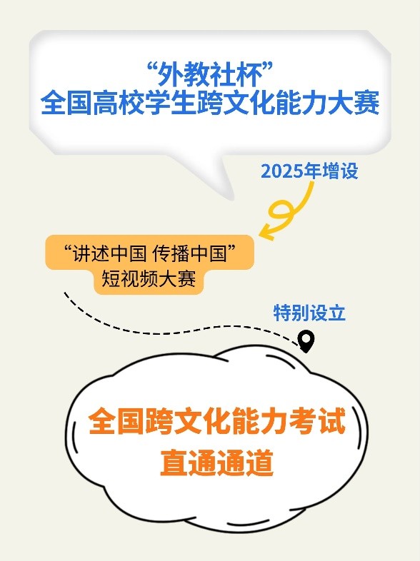 “外教社杯”全国高校学生跨文化能力大赛之“讲述中国 传播中国”短视频大赛特别设立全国跨文化能力考试直通通道。“外教社杯”全国高校学生跨文化能力大赛为教育部中国高等教育学会《2023全国普通高校大学生竞赛分析报告》竞赛目录赛事。