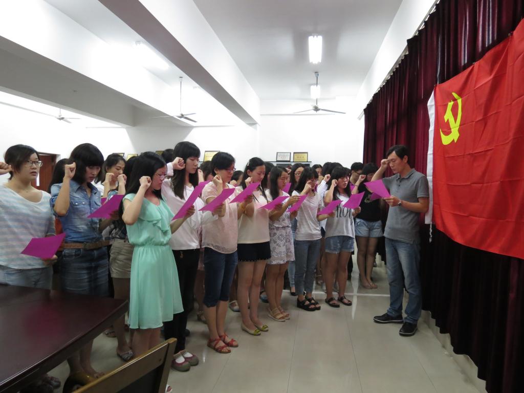 月30日下午,2015年足球篮球官方直播平台新党员“七一”宣誓大会在文科楼A349会议室举行。学院党委副书记赵莹、党委秘书许广玉、12级党支部书记王琰玲、13级党支部书记林天飞以及全体新党员参加仪式,仪式由王琰玲老师主持。
