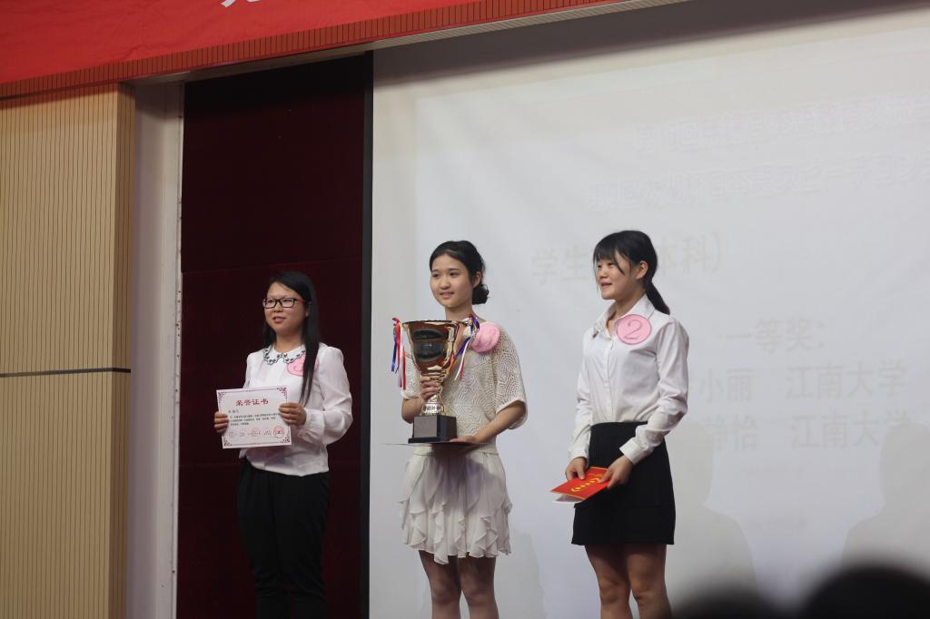 在此次演讲比赛中我校日语系13级学生王卉怡表现突出,以地道的日语发音及提问环节的流畅表达获得评委们的认可,荣获“本科组特等奖”及“评委特别奖第一名”,并将于今年11月份作为无锡青年代表去日本相模原市参加中日文化交流。此外罗小丽和陈静怡同学均凭流利的演说和出色的表现荣获“本科组一等奖”。中西由美子、西川明子、藤田美奈子三位日籍老师荣获优秀指导老师特别奖。