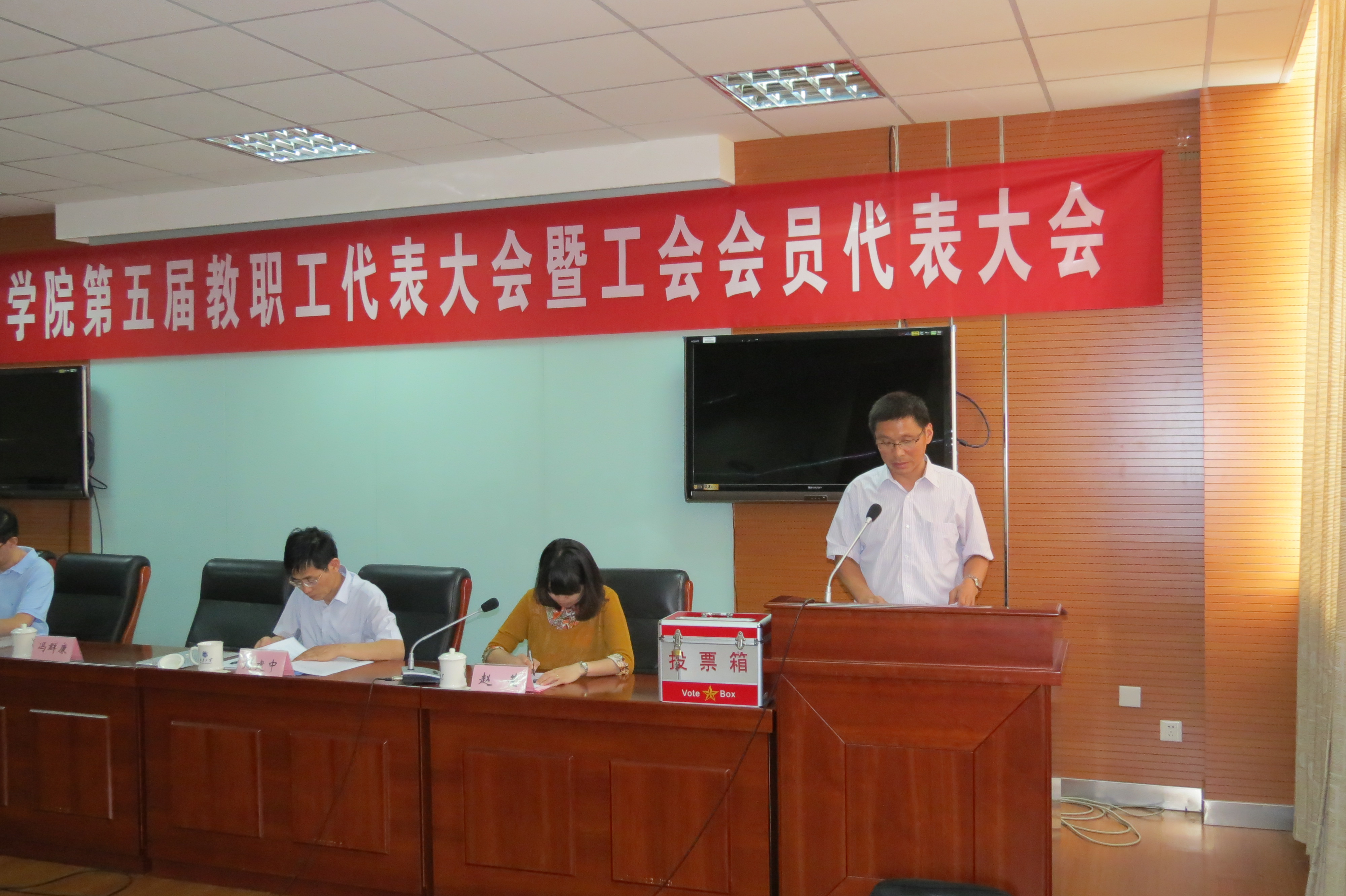 会上,龚晓斌院长作了题为《凝心聚力,务实进取,为足球篮球官方直播平台的可持续发展努力奋斗》的2011-2013行政工作报告,院分工会主席管纪龙代表学院第四届分工会委员会作了2011-2013分工会工作报告,随后52名教代会代表投票选举产生学院新一届分工会委员会委员和教代会执委会委员。