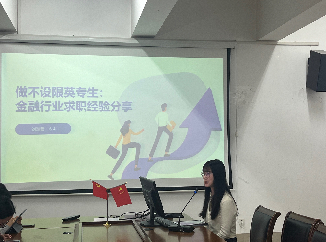 刘澍蕾同学的主题为“不设限的英专生”。她首先分享了自己对于当前就业市场的观察和思考,强调了英语专业人才在各行各业中的广泛应用和前景,鼓励同学们拓宽就业视野,国内各大银行不失为毕业生的一大好去处。随后,刘澍蕾同学对企业的求职流程展开了详细的介绍,她认为要及时关注求职网站并适当润色个人简历,结合英专生的专业优势进行选岗,认真准备笔试,同时在面试过程中保持从容和淡定。最后她贴心地为大家分享了行业的优缺点,为学弟学妹们提供宝贵建议,倡导大家理性选择。