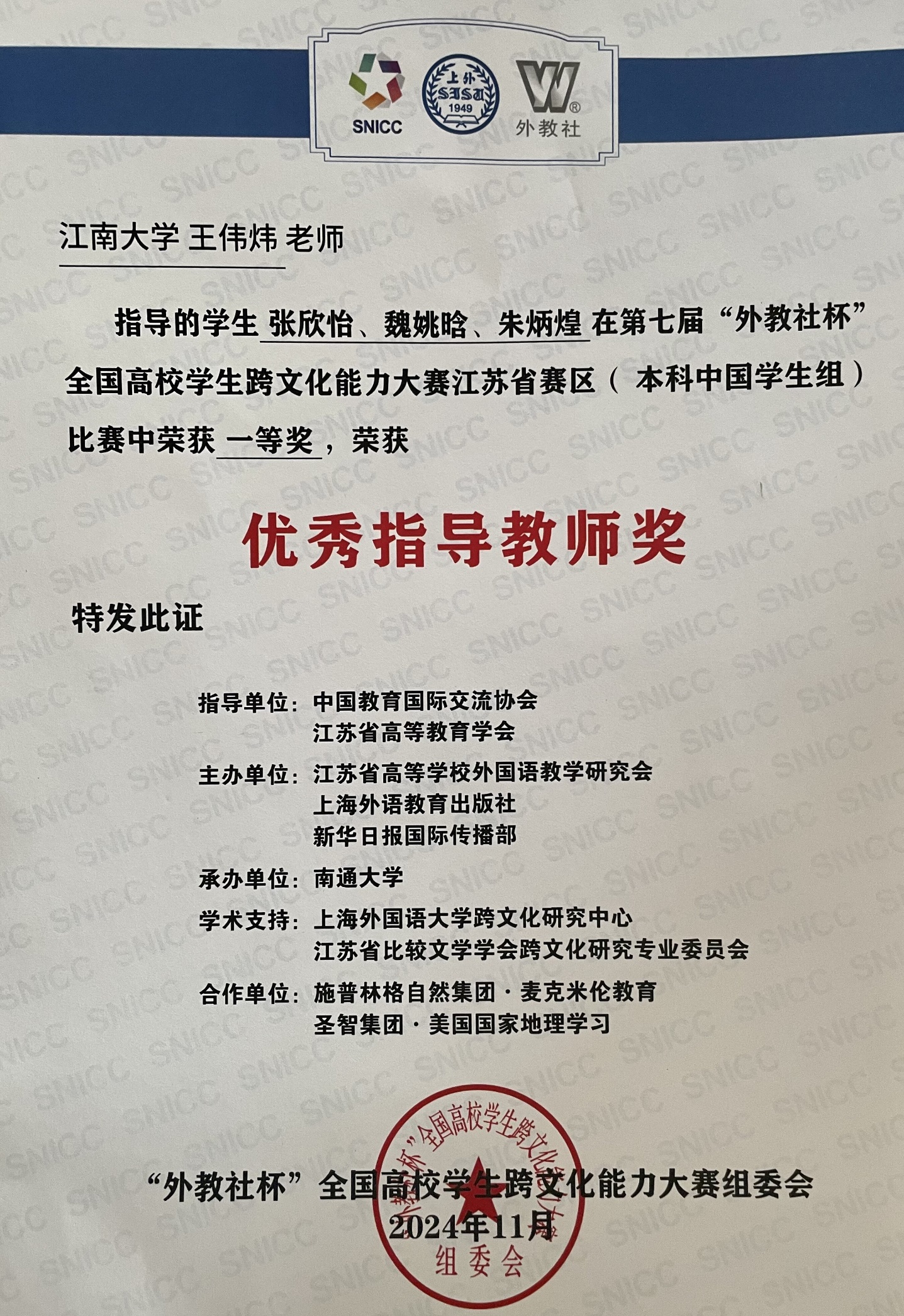 2024年11月1日至3日,第七届“外教社杯”全国高校学生跨文化能力大赛江苏省赛区比赛在南通大学成功举办。比赛分为本科中国学生组、高职中国学生组和国际学生组三个赛道,其中本科中国学生组共有包括来自南京大学、东南大学、南京理工大学、南京医科大学等43所高校的43个团队。经过激烈角逐,由我校足球篮球官方直播平台张欣怡、人文学院魏姚晗和生物工程学院朱炳煌组成的团队在指导老师王伟炜的带领下顺利晋级江苏省赛区决赛并最终荣获江苏省赛区一等奖。这是我校学子在此项比赛中继去年荣获省赛一等奖后的再次丰收。