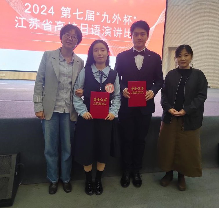 决赛的即兴演讲环节,面对南京大学、东南大学、苏州大学等强劲对手,两名参赛选手稳定发挥,杨炎学同学以内容生动、大方得体,再次以总排名第一的成绩获得一等奖;刘菁同学沉着冷静、语音语调标准获得二等奖。这是继连续两届我院学生在该赛事上获得最高奖一等奖后,复创佳绩,再续嘉话。此外我院田村恭平老师、中西由美子老师、吴颖老师荣膺指导教师奖。