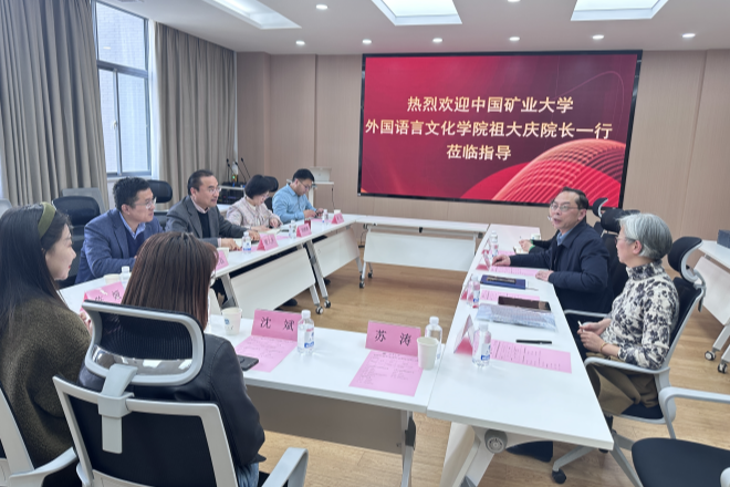 2025年3月11日,中国矿业大学外国语言文化学院院长祖大庆教授率代表团一行8人莅临我院,围绕学科建设、外语专业教育改革及公共外语教学创新等议题展开深入交流。院长方文开、副院长顾琦一、院长助理仵欣欣及相关系部负责人出席座谈会。