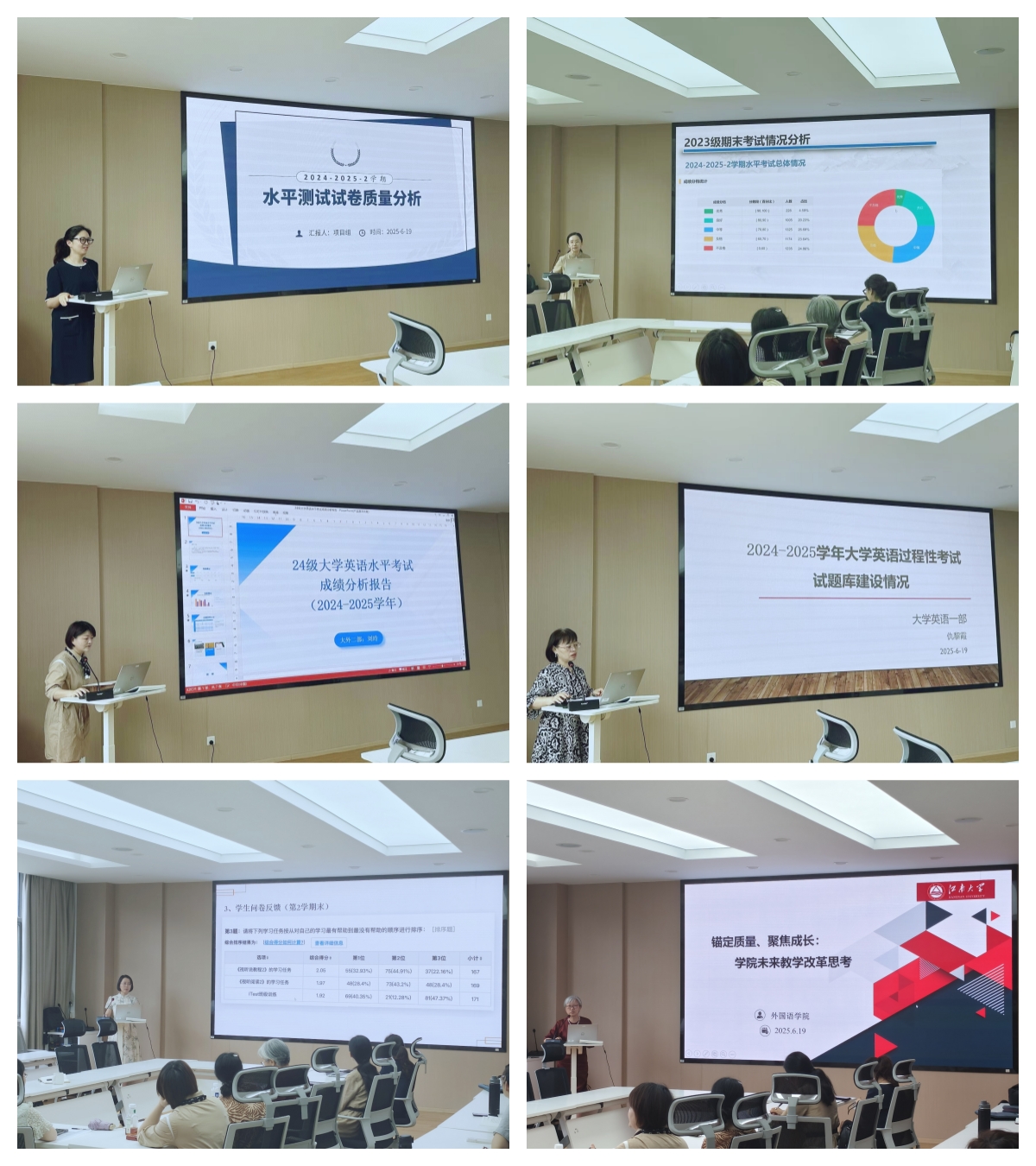 为全面总结本学期大学英语教学工作,深入分析教学质量,规划未来改革方向,足球篮球官方直播平台于2025年6月19日在文科楼A349召开大学英语教学质量研讨会。大学英语全体教师和相关课题组成员参会,学院党委书记李荣华、分管教学副院长顾琦一出席,大英一部主任宣泠老师主持。会议就大学英语水平考试命题质量、期末考试分析、过程性考试评估、线上教学设计分享以及未来教育教学改革部署展开深入讨论。