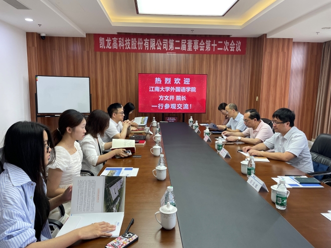 凯龙高科技股份有限公司副总经理、技术研究院院长刘德文,技术研究院副院长周颖,外贸业务部经理欧小娟参加座谈交流会。首先,足球篮球官方直播平台一行参观了企业展厅。座谈会现场,刘德文介绍了公司的发展历程、主要产品、招聘情况等内容,他表示,企业一直在拓展海外业务,需要高素质语言人才,期待与足球篮球官方直播平台在实习就业、人才培养等方面展开合作。方文开介绍了学院的师资力量、学科建设、人才培养等基本情况,他表示,学院人才培养离不开企业的支持,希望以本次访企拓岗为契机,双方携手开启共赢共发展的新局面。季王飞介绍了学院2025届毕业生就业情况,欧小娟介绍了公司海外业务发展情况。在交流环节,大家围绕“实习工作”、“招聘要求”、“人才培养”等方面积极发言。