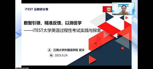 9月24日,围绕“AI驱动的外语测评革新”主题,在UNIPUS外研在线“基于iTEST智能测评云平台的系列云教研活动”中,大学英语一部主任宣泠老师做了主题为“数智引领,精准反馈,以测促学——iTEST大学英语过程性考试实践与探索”的精彩讲座,着重分享了我院响应学校公共基础课教考分离教学改革的重要举措、过程性评价在教学过程中的核心作用以及基于iTEST的过程性考试实施解读。