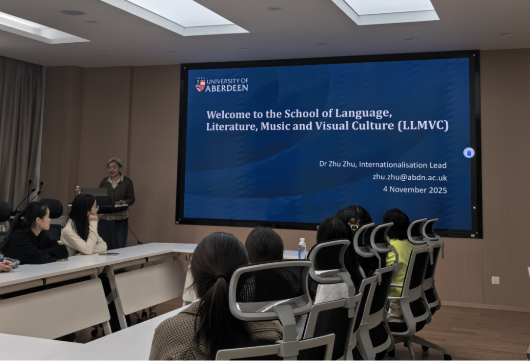 朱珠介绍了阿伯丁大学的办学历史、师资队伍、学术影响等情况,在语言文化、人文社科领域积淀深厚,是一所办学历史悠久、学术影响力强的高校。随后,她着重从课程体系设置、学科布局、培养方向等方面展示了音乐与视觉文化学院的基本情况。她表示,音乐与视觉文化学院的课程涵盖从基础语言教学到高阶文化研究,课程体系覆盖多语种、多方向,且师资团队兼具学术深度与行业经验,能为学生提供理论实践双轨培养。