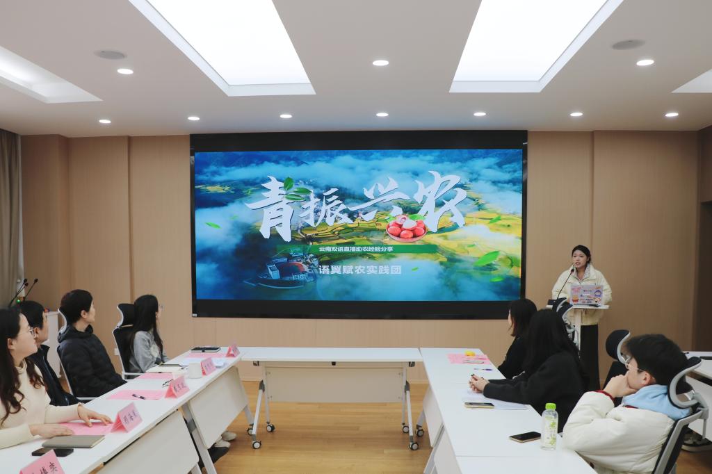 朱彤以“十五五”规划中华体会体育高水平对外开放的重点内容为切入点,引导同学们深化对外语专业服务国家战略的认识,强化以语言回应时代需求、以专业能力投身社会发展的使命意识。“语翼赋农”实践团队成员徐思婉介绍了双语直播助农的实践过程,并以模拟直播的形式现场展示外语赋能乡村产业的实际价值与应用路径。高赵一涵同学围绕“跨文化交流项目”进行经验分享,从多个角度总结团队在多元文化情境中的学习成果与实践收获。