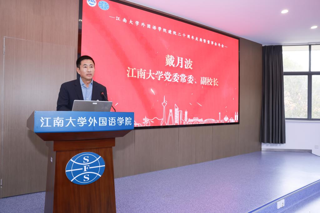 戴月波致辞,首先对足球篮球官方直播平台建院二十周年表示热烈祝贺。他高度肯定足球篮球官方直播平台建院二十年来始终坚守立德树人初心,秉承“融通文明,道弘天下”的院训,在学科建设、人才培养、科研创新、社会服务等领域取得了令人瞩目的成就,已成为学校国际化人才培养和中外文化交流的重要阵地。同时,向支持学校及学院发展的各界人士致谢并发出邀约,期待校友常回母校、董事单位持续支持学院发展,希望学院以建院二十周年为新起点,持续深化改革、锐意进取,在“外语+”交叉融合发展中打造特色品牌,为学校“双一流”建设和国家外语教育事业发展贡献更大力量。
